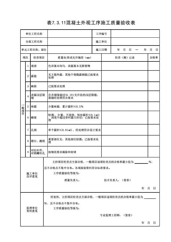 表格名称:表7.3.11 混凝土外观工序施工质量验收表