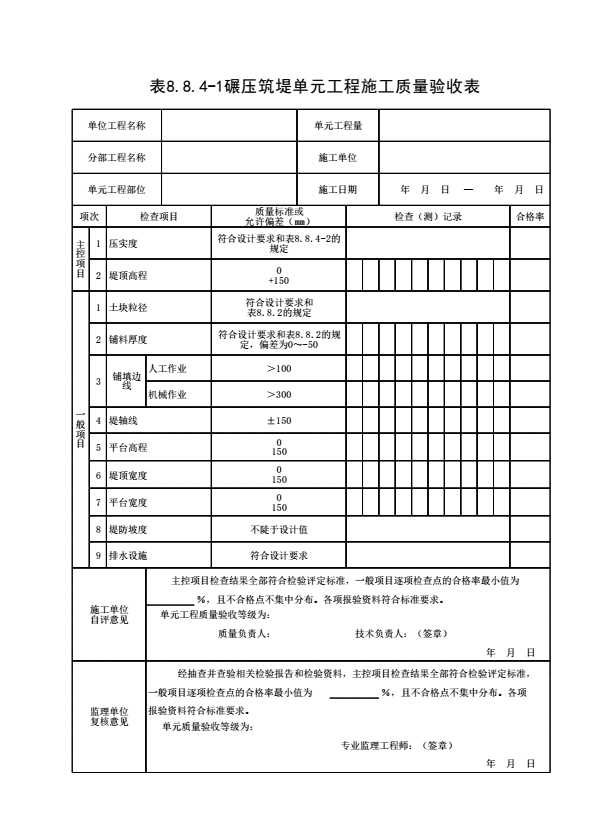 表格名称:表8.8.4-1 碾压筑堤单元工程施工质量验收表