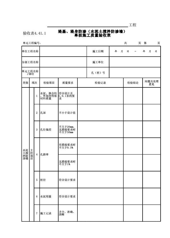 表4.41.1 堤基、堤身防渗(水泥土搅拌防渗墙)单桩施工质量验收表