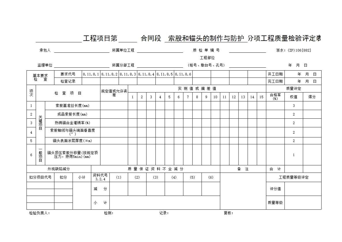 表格名称:082 索股和锚头的制作与防护分项工程质量检验评定表