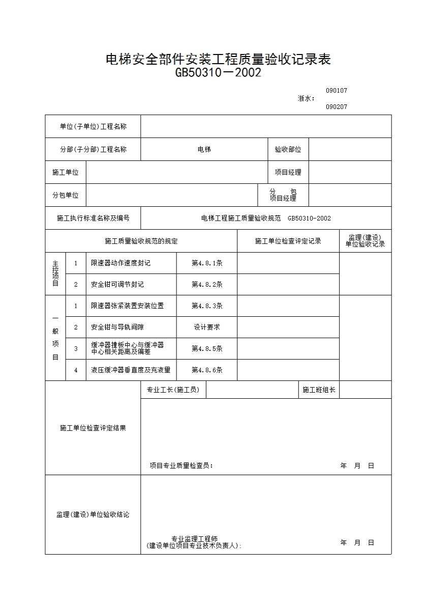 表格名称:233 电梯安全部件安装工程质量验收记录表