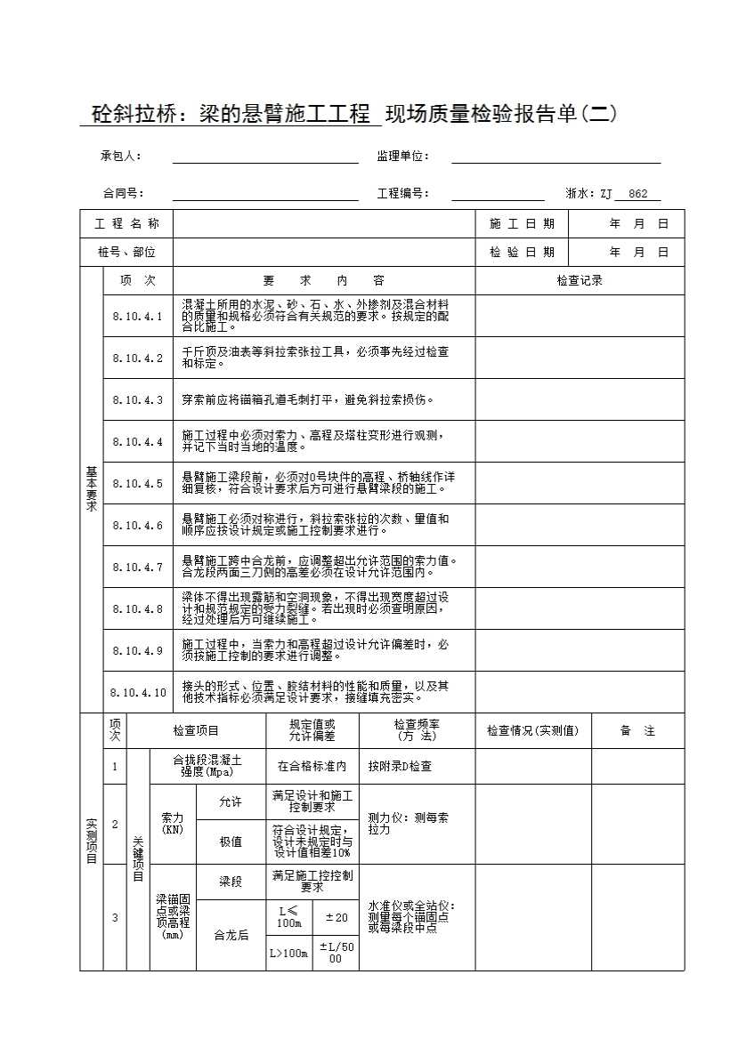 浙水:ZJ862 砼斜拉桥:梁的悬臂施工工程现场质量检验报告单(二)