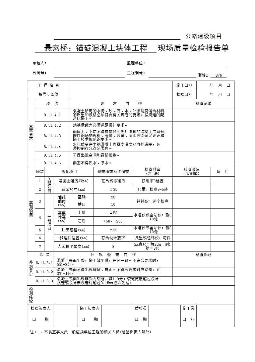表格名称:浙路ZJ876 悬索桥:锚碇混凝土块体工程现场质量检验报告单