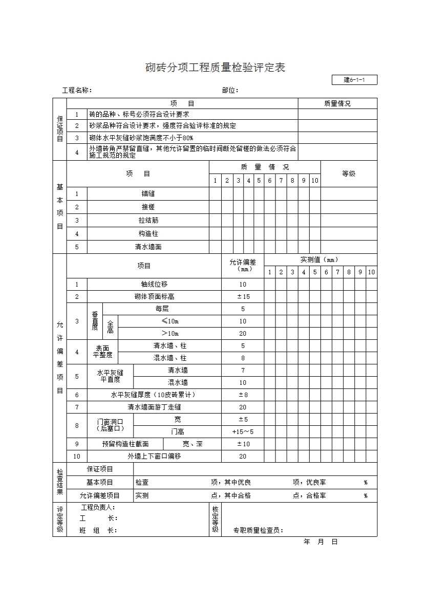 表格名称:砌砖分项工程质量检验评定表