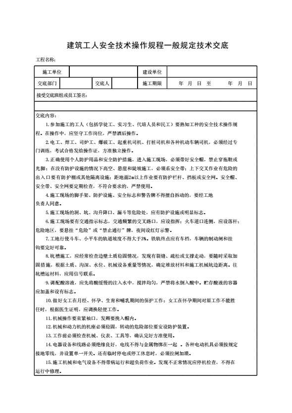表格名称:建筑工人安全技术操作规程一般规定技术交底