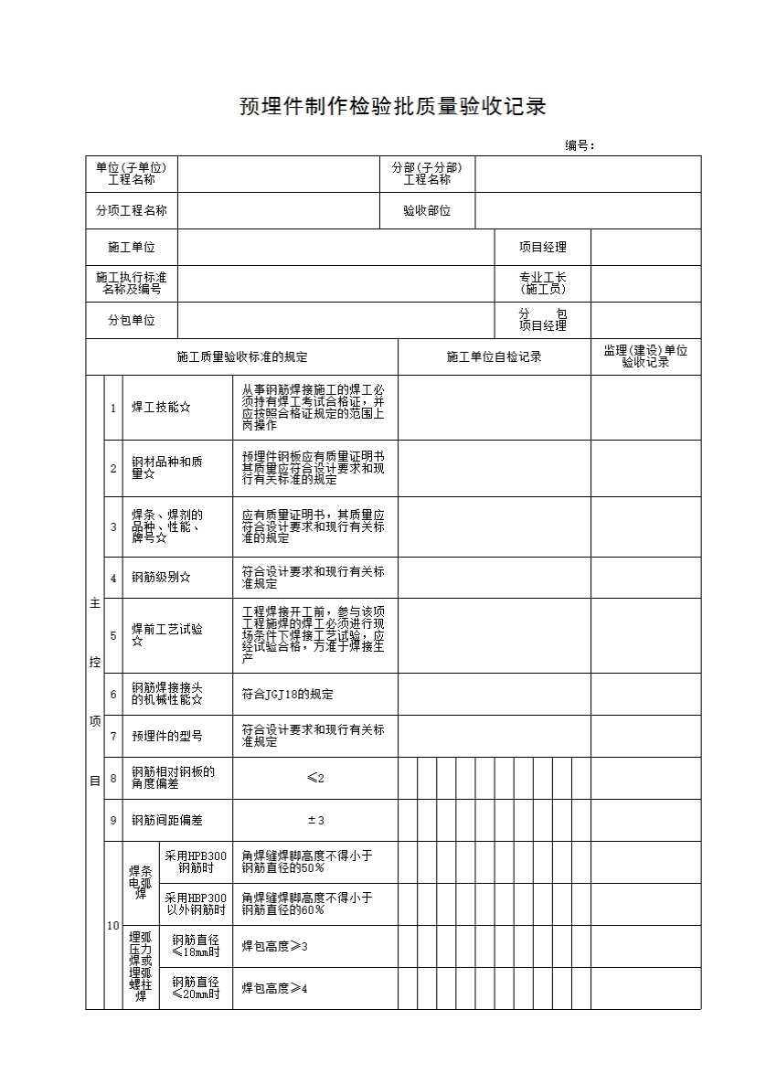 表格名称:B.1 预埋件制作检验批质量验收记录