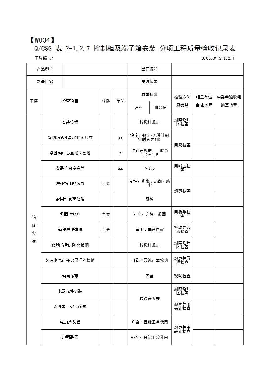 QCSG 表 2-1.2.7 控制柜及端子箱安装 分项工程质量验收记录表