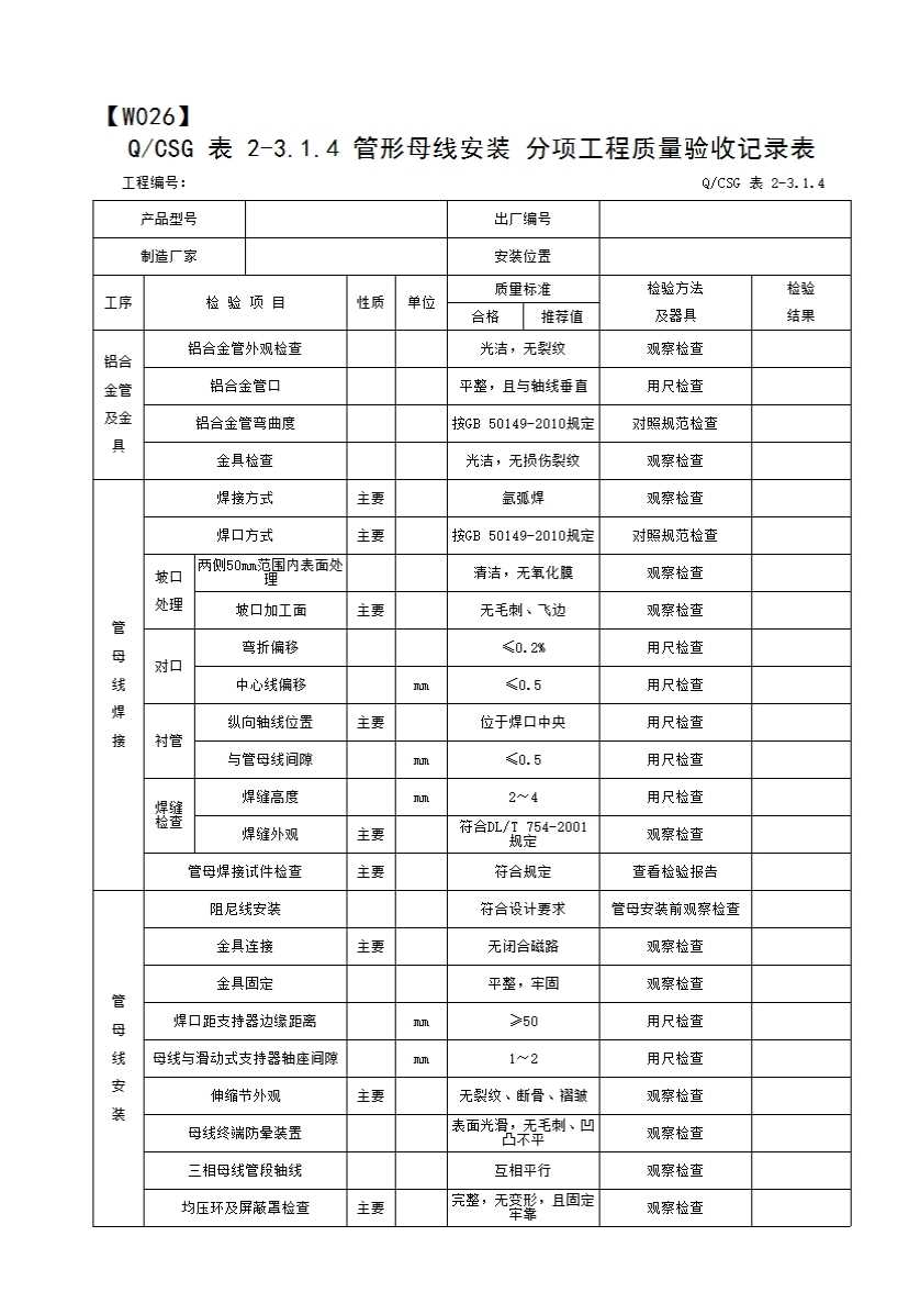 表格名称:QCSG 表 2-3.1.4 管形母线安装 分项工程质量验收记录表
