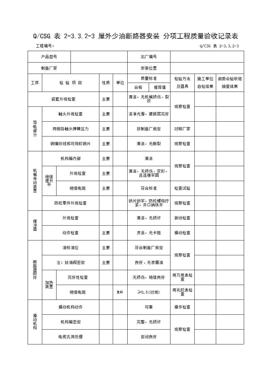 表格名称:QCSG 表 2-3.3.2-3 屋外少油断路器安装 分项工程质量验收记录表