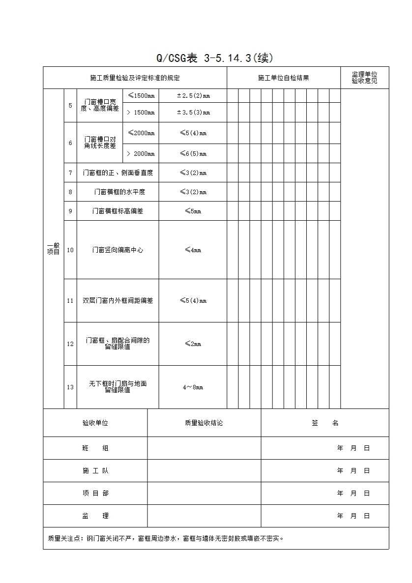 表格名称:QCSG 表 3-5.14.3 钢门窗安装工程检验批质量验收记录表