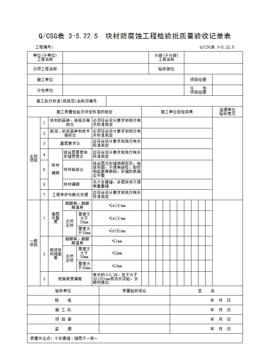 表格名称:QCSG 表 3-5.22.5 块材防腐蚀工程检验批质量验收记录表
