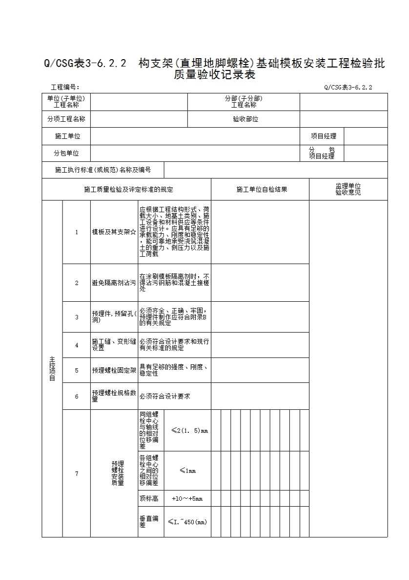 QCSG 表 3-6.2.2 构支架(直埋地脚螺栓)基础模板安装工程检验批质量验收记录表