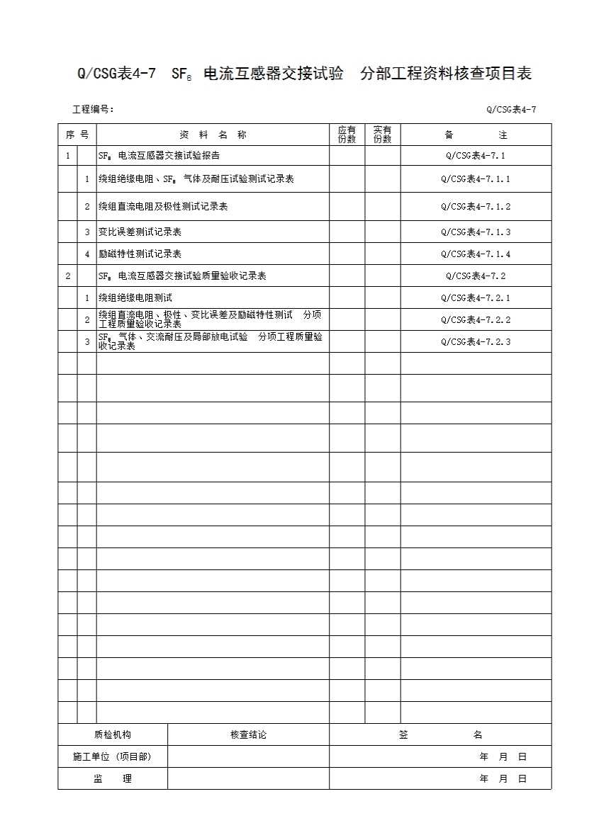 QCSG 表 4-7 SF6电流互感器交接试验 分部工程资料核查项目表
