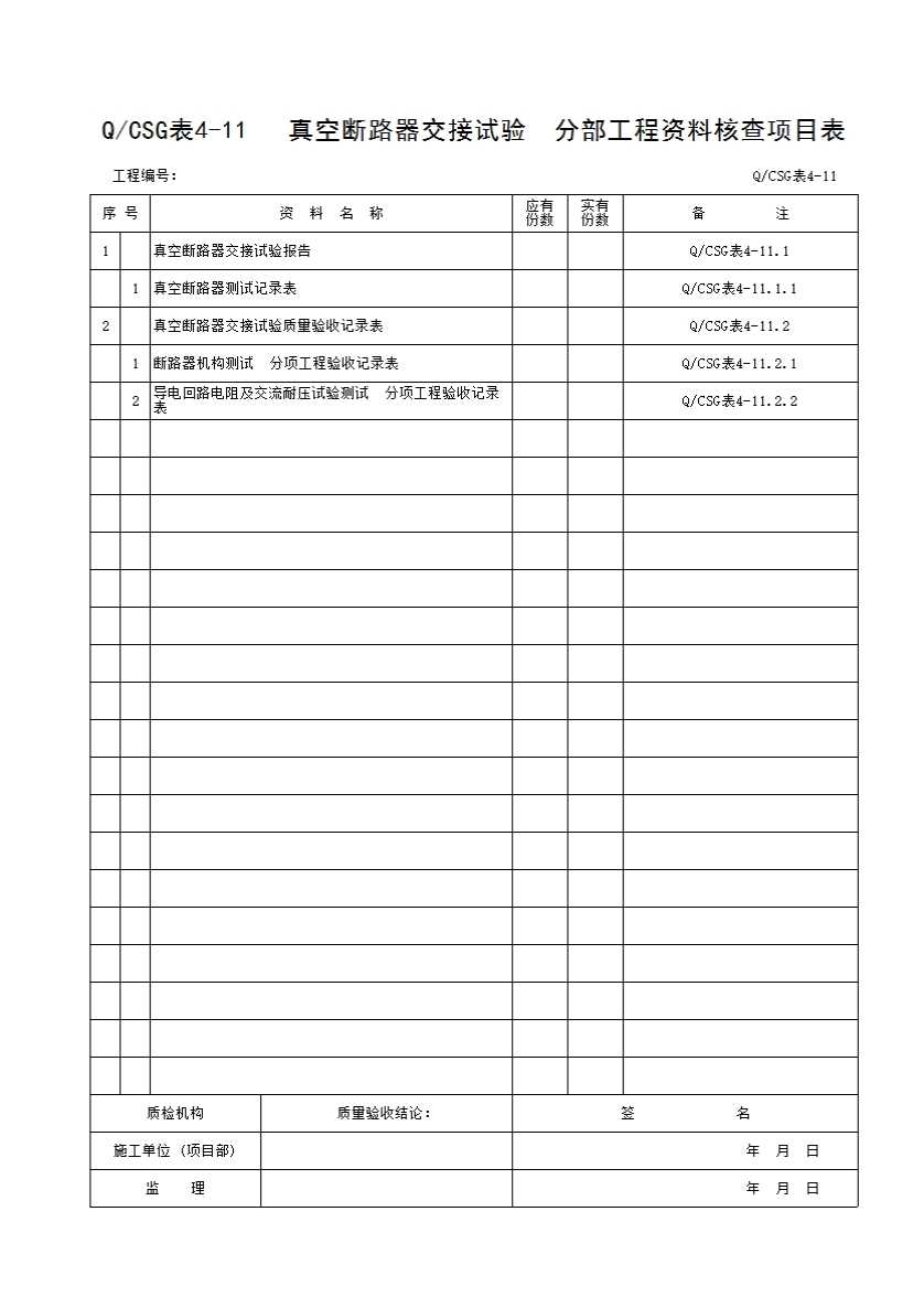 QCSG 表 4-11 真空断路器交接试验 分部工程资料核查项目表