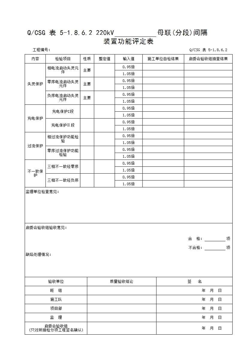 表格名称:QCSG 表 5-1.8.6.2 220kV_____母联(分段)间隔 装置功能评定表