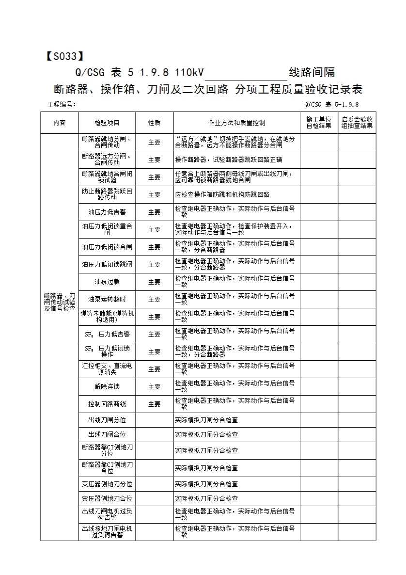 表格名称:QCSG 表 5-1.9.8 110kV______线路间隔断路器、操作箱、刀闸及二次回路 分项工程质量验收记录表