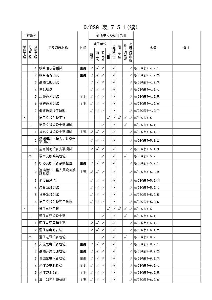QCSG 表 7-5-1 变电通信工程质量验收与评定范围划分表