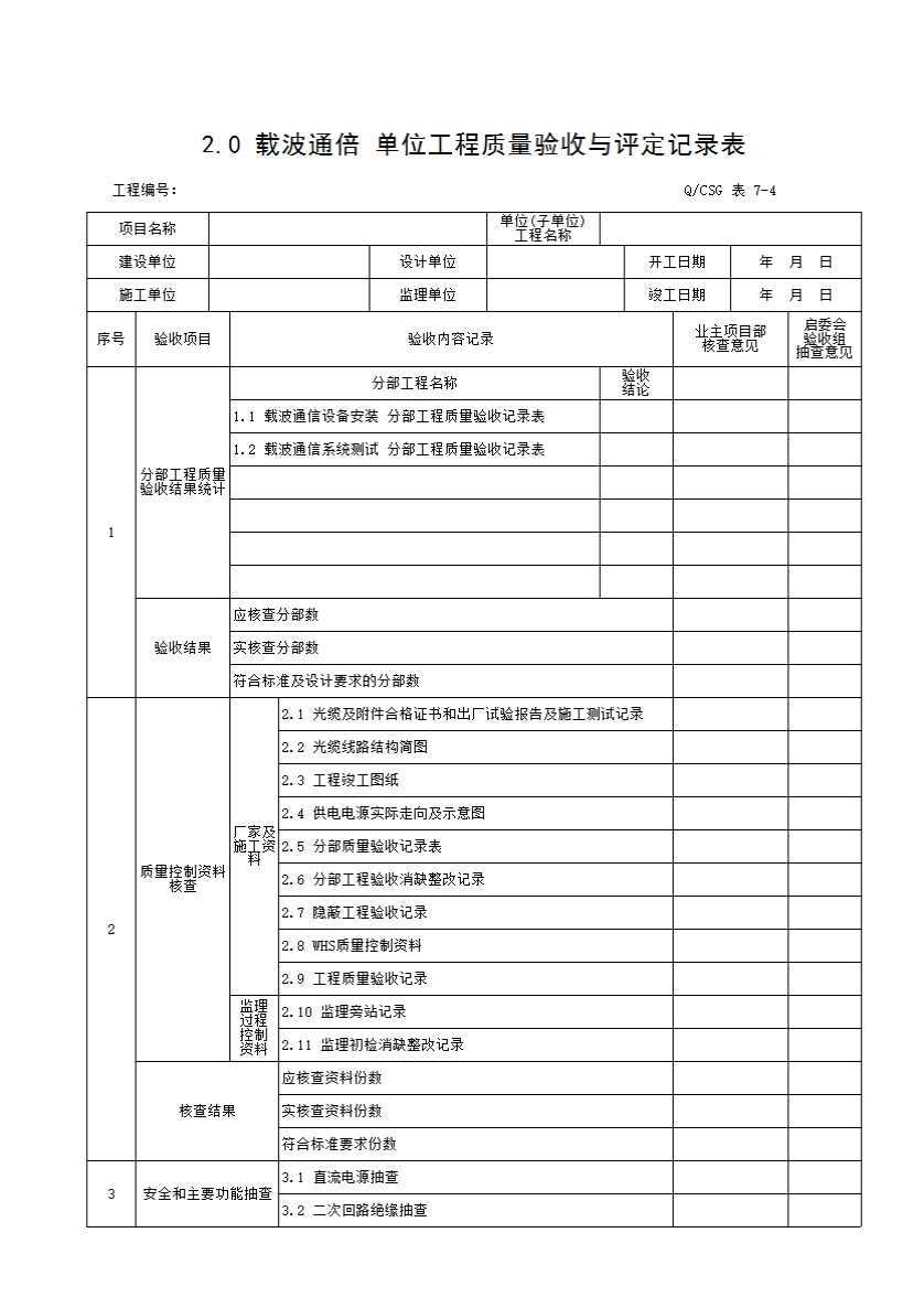表格名称:2.0 载波通信 单位工程质量验收与评定记录表
