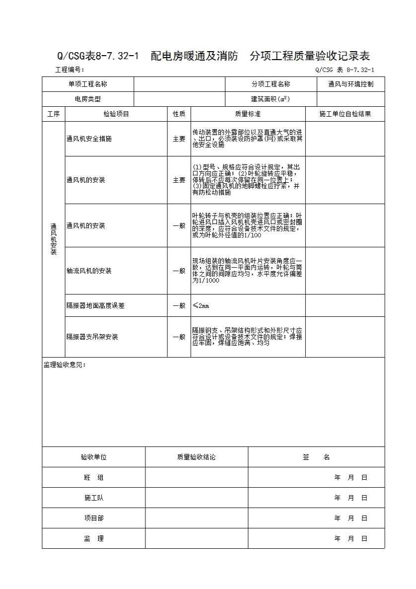 表格名称:QCSG 表 8-7.32-1 配电房暖通及消防 分项工程质量验收记录表