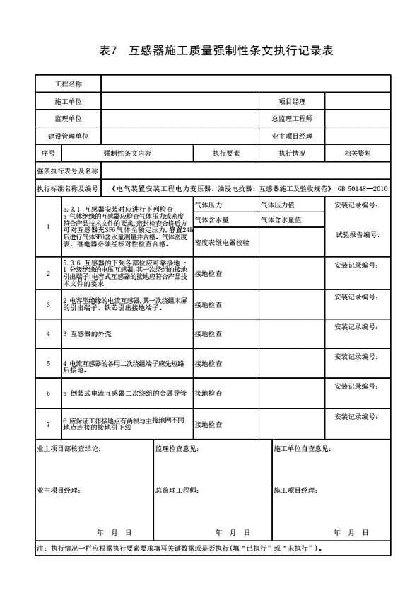 表格名称:表7 互感器施工质量强制性条文执行记录表