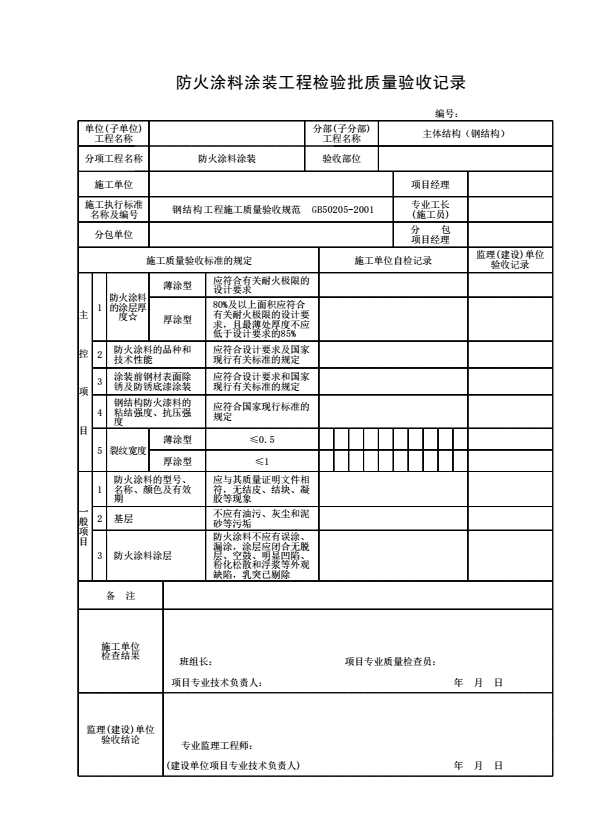 表格名称:防火涂料涂装工程检验批质量验收记录