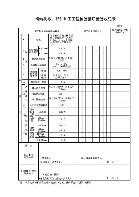 表格名称:钢结构零、部件加工工程检验批质量验收记录