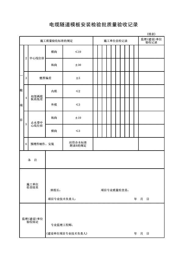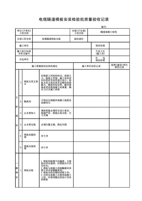 表格名称:电缆隧道模板安装检验批质量验收记录