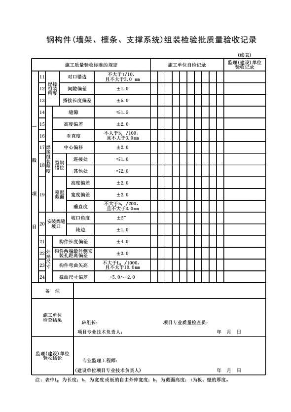 表格名称:钢构件(墙架、檩条、支撑系统)组装检验批质量验收记录