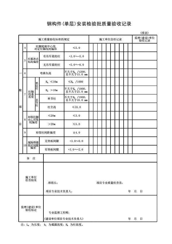 表格名称:钢构件(单层)安装检验批质量验收记录