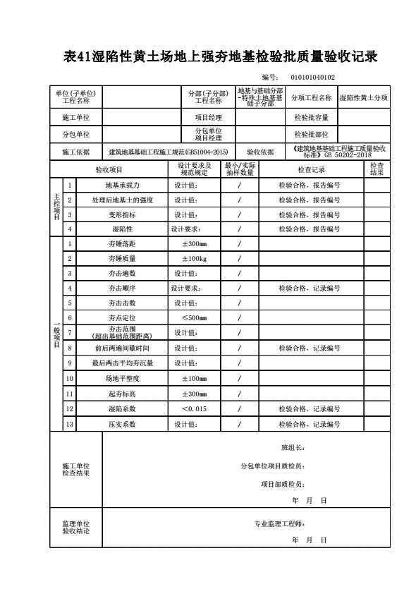 表格名称:010101040102 湿陷性黄土场地上强夯地基检验批质量验收记录