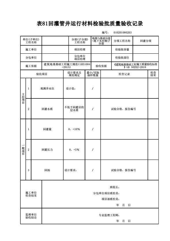 表格名称:010201080203 回灌管井运行检验批质量验收记录