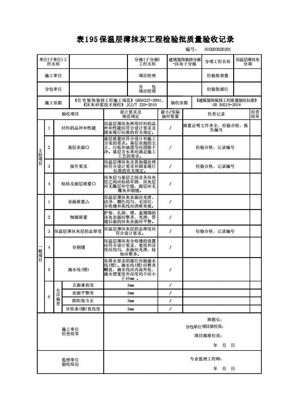 表格名称:010203020201 保温层薄抹灰工程检验批质量验收记录