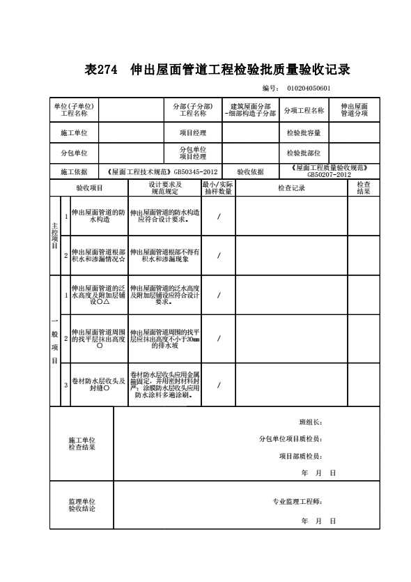表格名称:010204050601 伸出屋面管道工程检验批质量验收记录