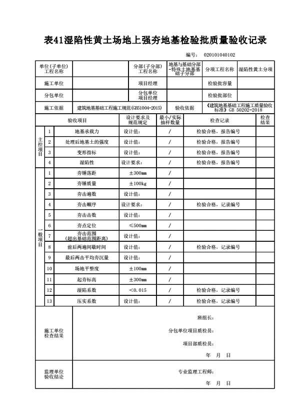 表格名称:020101040102 湿陷性黄土场地上强夯地基检验批质量验收记录