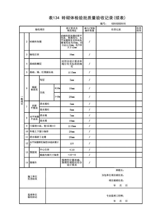 表格名称:020102020101 砖砌体检验批质量验收记录
