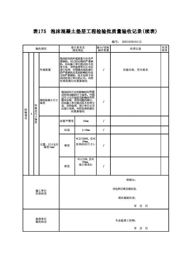 表格名称:020103010112 泡沫混凝土垫层工程检验批质量验收记录
