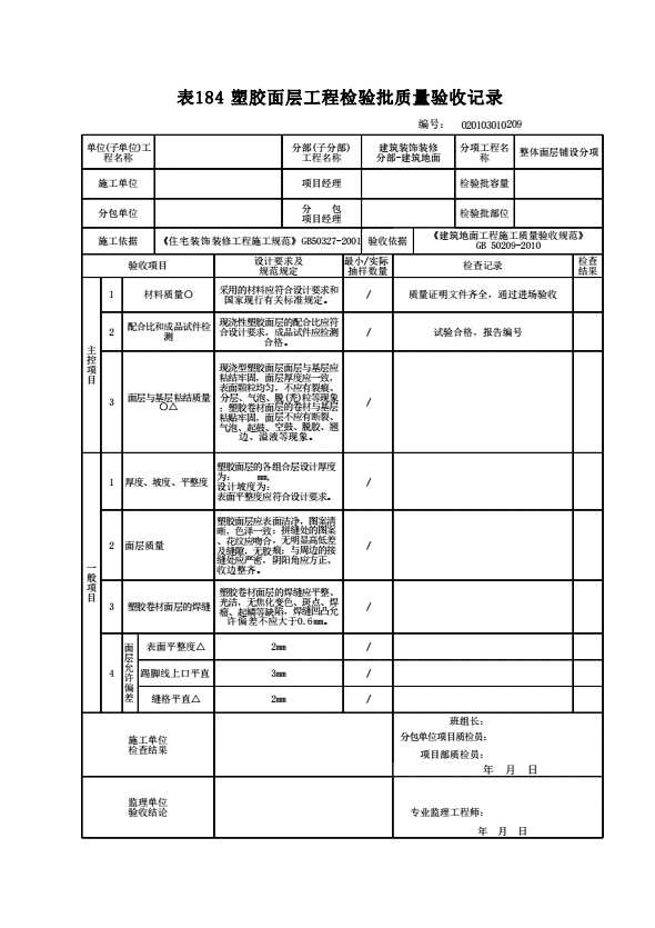 表格名称:020103010209 塑胶面层工程检验批质量验收记录