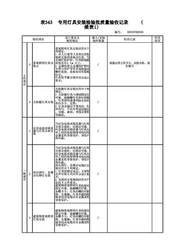 表格名称:020107020401 专用灯具安装检验批质量验收记录