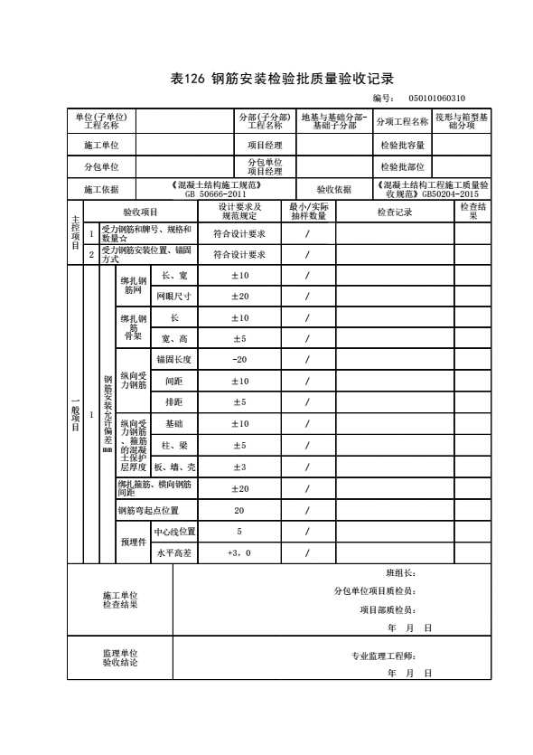 表格名称:050101060310 钢筋安装检验批质量验收记录