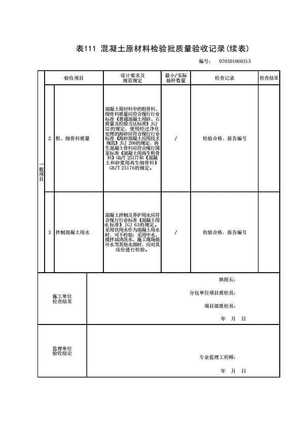 表格名称:070301060315 混凝土原材料检验批质量验收记录