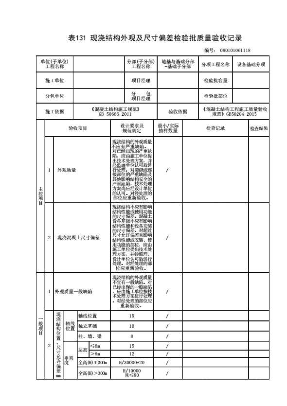 表格名称:080101061118 现浇结构外观及尺寸偏差检验批质量验收记录