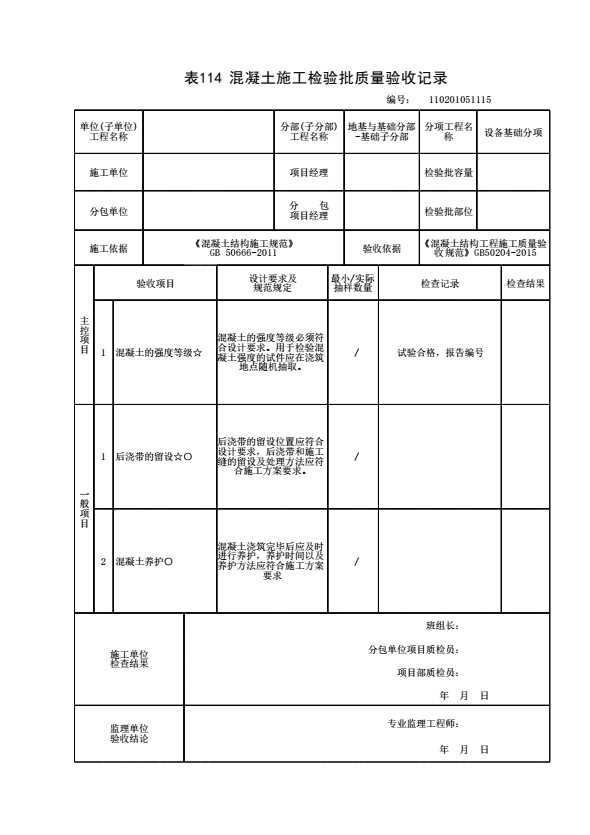表格名称:110201051115 混凝土施工检验批质量验收记录