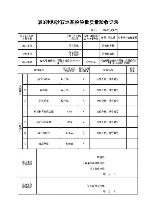 表格名称:110301030201 砂和砂石地基检验批质量验收记录