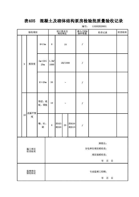 表格名称:110302020801 混凝土及砌体结构泵房检验批质量验收记录