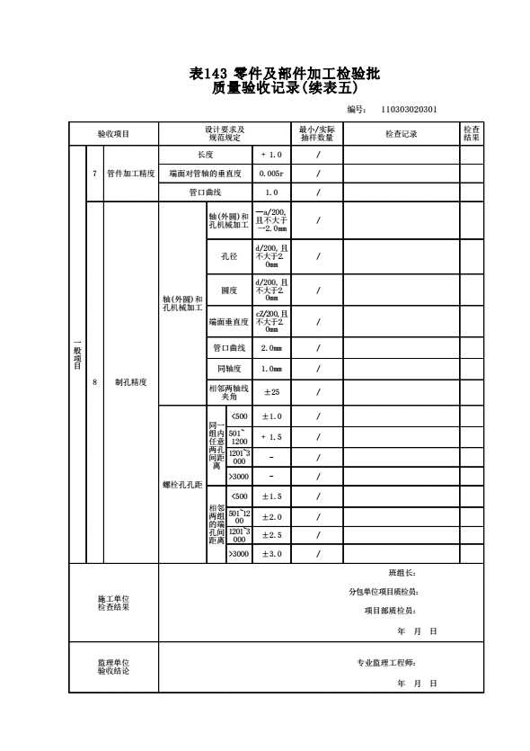 表格名称:110303020301 零件及部件加工检验批质量验收记录