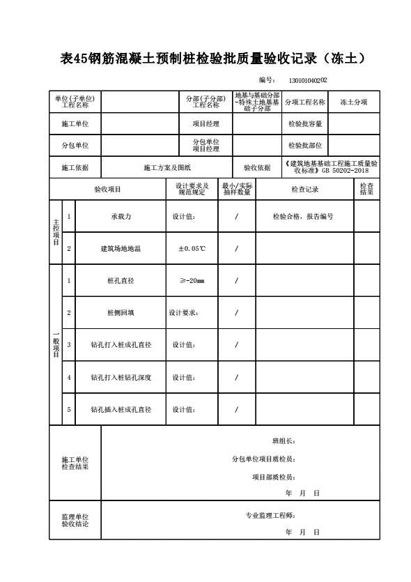 表格名称:130101040202 钢筋混凝土预制桩检验批质量验收记录(冻土)