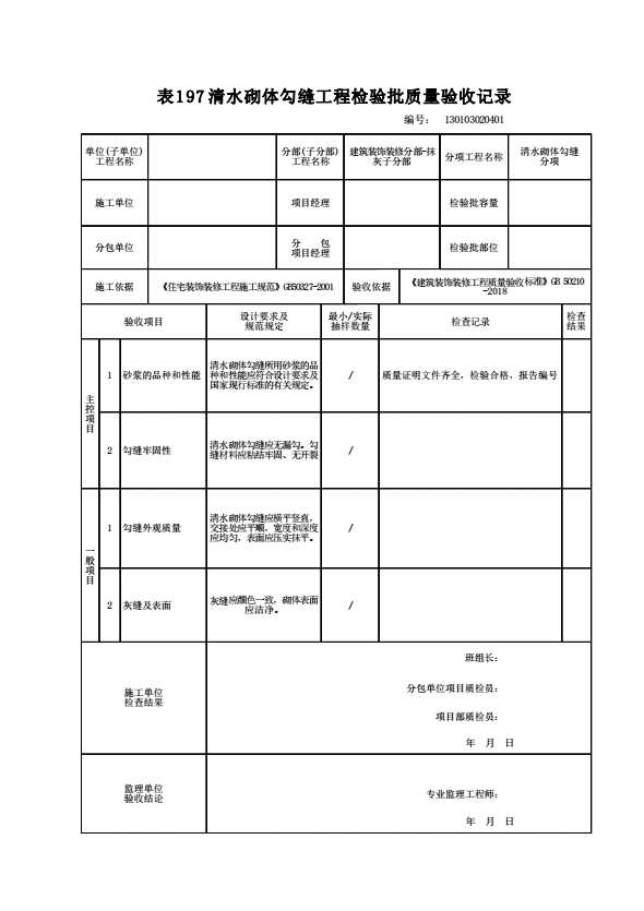 表格名称:130103020401 清水砌体勾缝工程检验批质量验收记录