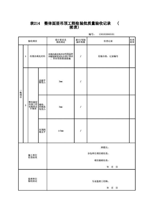 表格名称:130103060101 整体面层吊顶工程检验批质量验收记录