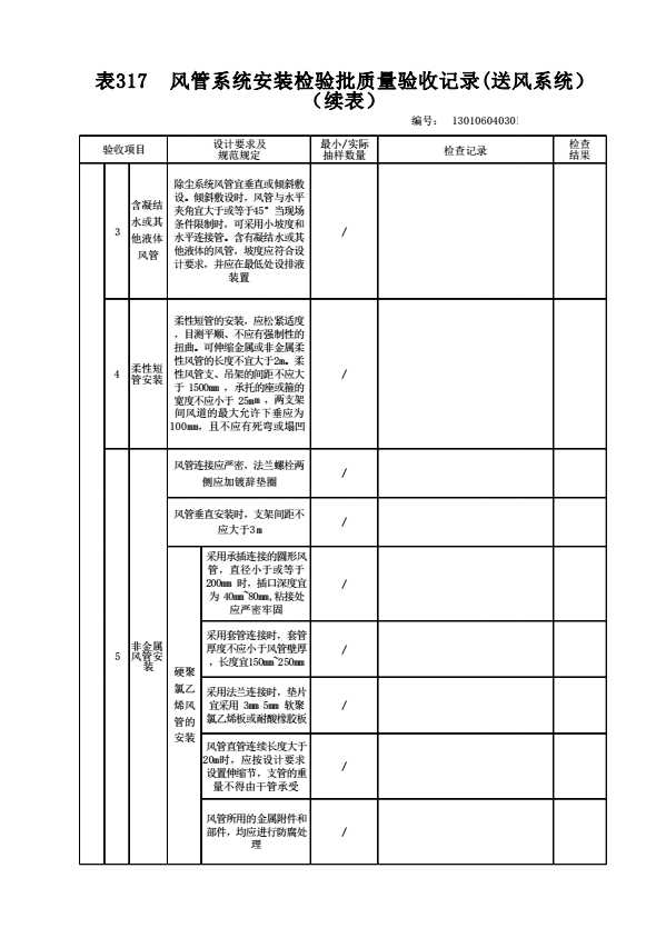 表格名称:130106040301 风管系统安装检验批质量验收记录(送风系统)