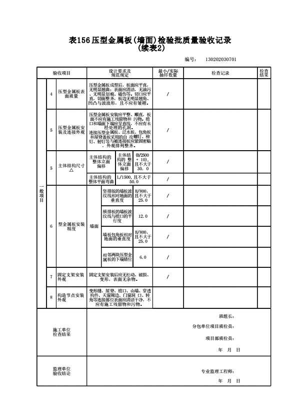 表格名称:130202030701 压型金属板(墙面)检验批质量验收记录